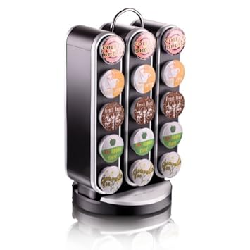 Stop hiding the K-cups in cabinets and drawers; on the contrary, display them in style with this elegant and fun spinning Vortex carousel. Insert each K-Cup single serve pod into our self-locking system and watch how they stay in place even at a 90 degree tilt! The entire system rotates smoothly on a secure base for easy access to your favorite serving. The chrome handle adds the finishing touch on this modern and elegant carousel.